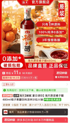 市面上锚定健康需求的调味品并不罕见,这让海天相关业务部门对橘子醋的爆火颇感意外。在团队针对平台消费者反馈调研分析后,海天发现,这款橘子醋畅销主要有两个原因:其一是选材天然,配料简单,“只用到了蜜桔”;其二是拓宽了调味品的使用场景,除了烹饪调味外,还能作为蘸料、甚至饮料等。
