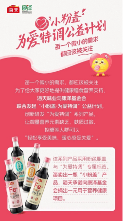 二十余年间,海天累计售出铁强化酱油约1.4亿瓶,惠及超2300万人。秉持“每一个微小的需求,都应当被关注”的理念,海天主动倾听特殊人群的真实需求,不断在产品上做“加法”和“减法”,从最初的铁强化酱油,延伸至包括铁强化、无麸质、无蔗糖、富硒减盐等多功能的产品,升级为系统性的“小粉盖·为爱特调”产品系列,精准覆盖微量营养元素缺乏、麸质过敏、控盐控糖等特殊人群。此外,海天还承诺,每售出一瓶小粉盖产品,便捐出一元用于公益。