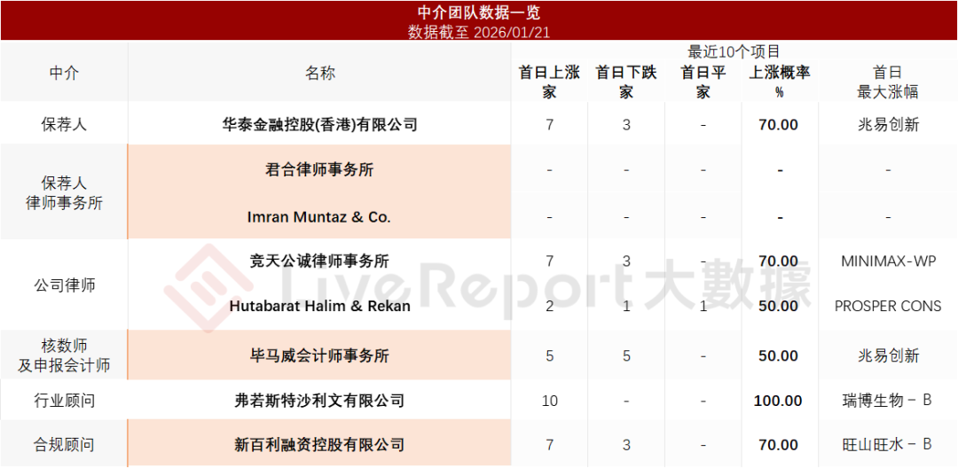 据LiveReport大数据统计,沃客非凡中介团队共计8家,其中保荐人1家,近10家保荐项目数据表现平稳;公司律师共计2家,综合项目数据表现缺乏亮点。整体而言中介团队历史数据表现中规中矩。