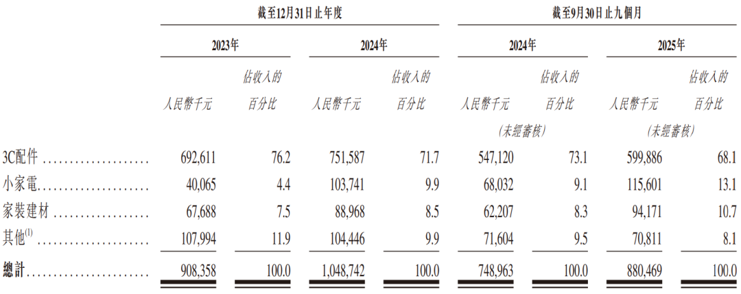 公司收入主要来自3C配件、小家電、家装建材及其他相关产品销售与服务,重大部分来自3C配件业务,2023年和2024年分别占总营收的76.2%和71.7%,是核心收入支撑。