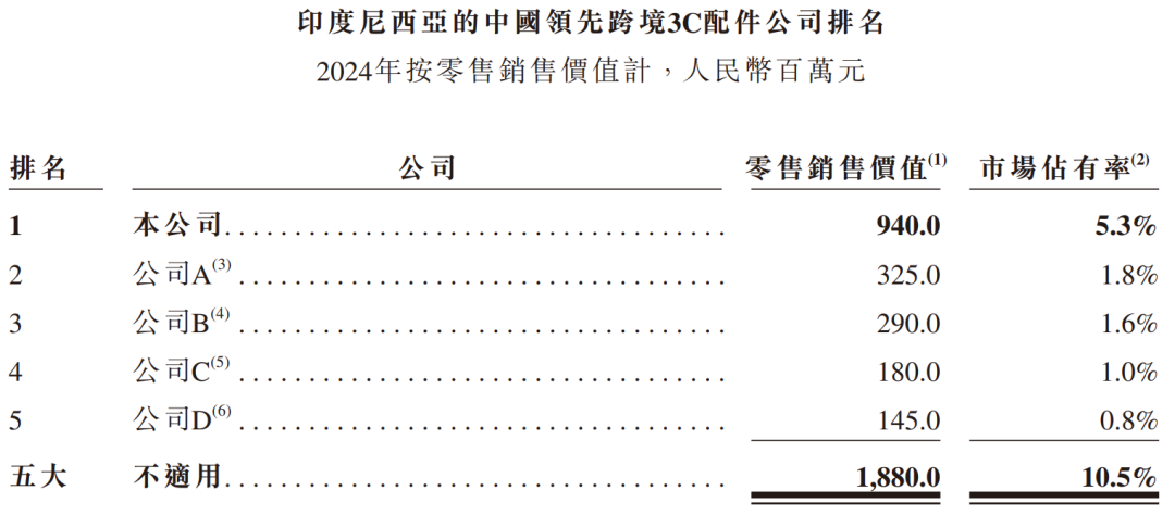 2024年,向印度尼西亚出口3C配件的五大中国企业的零售销售价值合计达约人民币1,880.0百万元,占中国与印度尼西亚3C配件出口市场份额约10.5%,公司于3C配件类别为印度尼西亚排名第一的中国跨境公司。