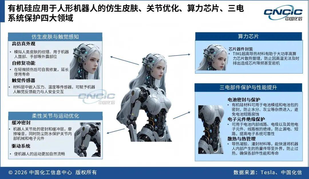 在“十五五”时期,化工新材料将从传统的原材料补充提升为战略性新兴产业的重要驱动力。随着半导体先进制程、量子计算、人形机器人等未来产业的爆发,材料的性能上限直接决定了终端产品的功能边界。例如,在“十四五”末期实现的国产光刻胶单体和 T1000 级碳纤维的稳定供应,不仅缓解了供应安全压力,更通过材料端的性能突破推动了下游装备的技术升级。另一个例子,有机硅材料可用于人形机器人多个部件,为产品设计创新与升级提供了极强的可拓展性。这种定位的转变,要求行业不仅要实现自给率的提升,更要在关键节点上具备技术主导能力。