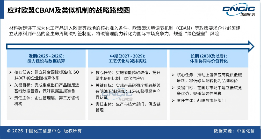 随着欧盟碳边境调节机制(CBAM)的逐步落地及国内碳配额交易的成熟,绿色低碳已从外部责任转变为企业的核心财务成本。2026 年起,化工产品在全球供应链中的地位,将很大程度上取决于其全生命周期的碳配额管理和化学回收再利用率。能够建立可追溯体系、提供低碳足迹认证的企业,将在出口贸易和高端客户认证中获得显著的竞争优势。中国企业正从被动的标准执行者,逐步转向绿色可持续发展规则的积极参与者。