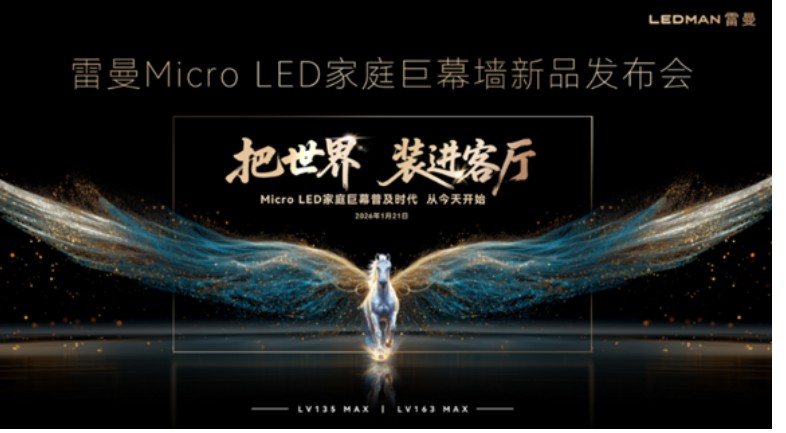 1月21日,A股首家上市的LED显示企业雷曼光电(300162.SZ)在深圳成功举办“把世界,装进客厅”新品发布会,正式推出LV135 Max与LV163 Max两款Micro LED家庭巨幕墙,是公司的第三代家庭巨幕产品。此次发布的产品不仅打破了长期以来超大尺寸显示设备的技术与成本壁垒,更标志着Micro LED技术从商用走向民用的步伐加速,为中国LED显示产业开辟万亿级新蓝海市场。