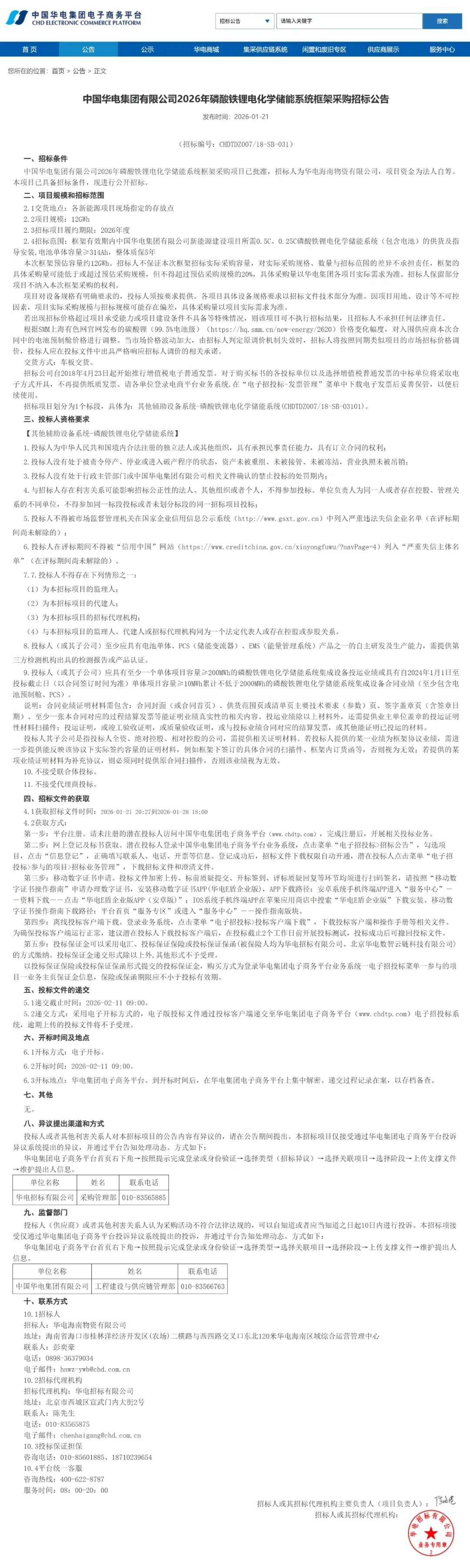 1月21日,中国华电集团有限公司发布2026年光伏组件、磷酸铁锂电化学储能系统招标公告。
