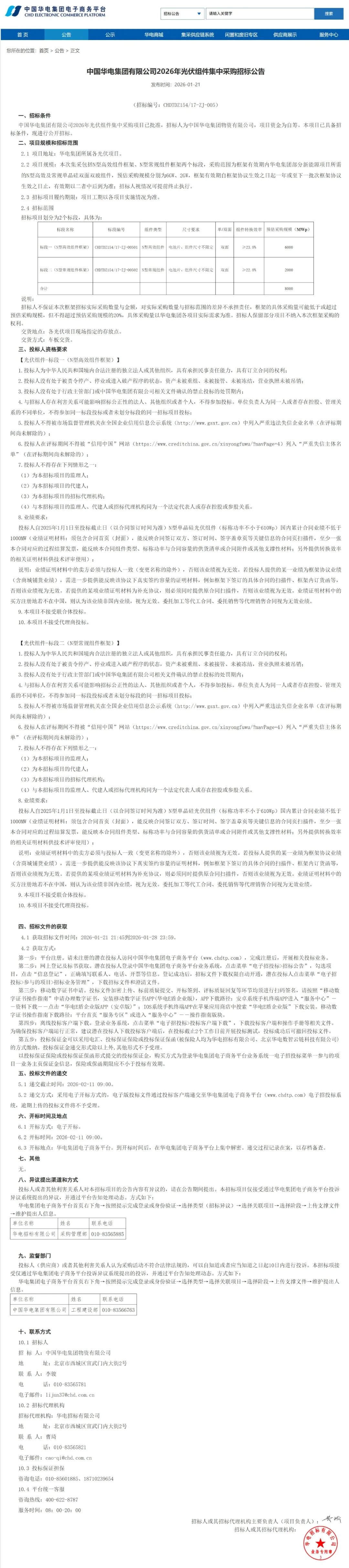8GW光伏组件、12GWh储能系统!华电发布2026年光储设备招标