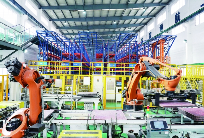 在江铜集团贵溪冶炼厂智能化电解车间,机器臂进行铜板转运作业。