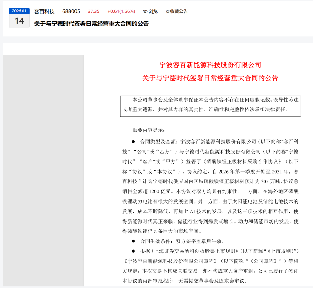 2026年1月,宁波容百新能源科技股份有限公司(容百科技,688005.SH)因一份涉及金额超1200亿元的“日常经营重大合同”公告,因信息披露不准确、不完整,涉嫌误导性陈述,被上海证券交易所火速问询,并最终收到中国证券监督管理委员会的立案告知书。