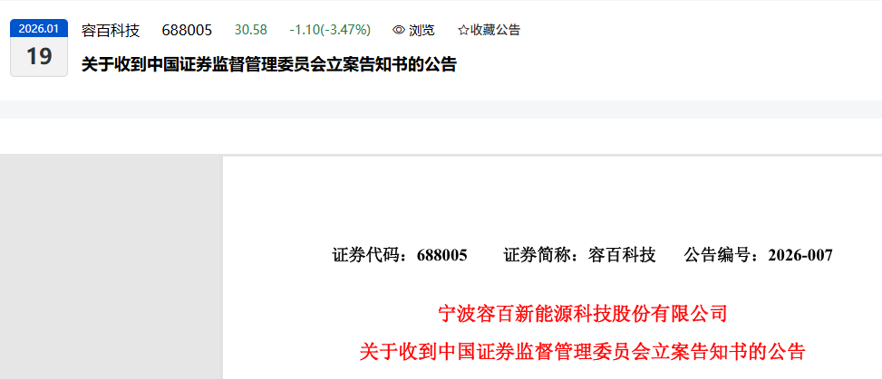 宁波容百新能源科技股份有限公司(以下简称“公司”)于2026年1月18日收到中国证券监督管理委员会(以下简称“中国证监会”)下发的《立案告知书》(编号:证监立案字0222026004号),因公司重大合同公告涉嫌误导性陈述等,根据《中华人民共和国证券法》《中华人民共和国行政处罚法》等法律法规,中国证监会决定对公司予以立案。
