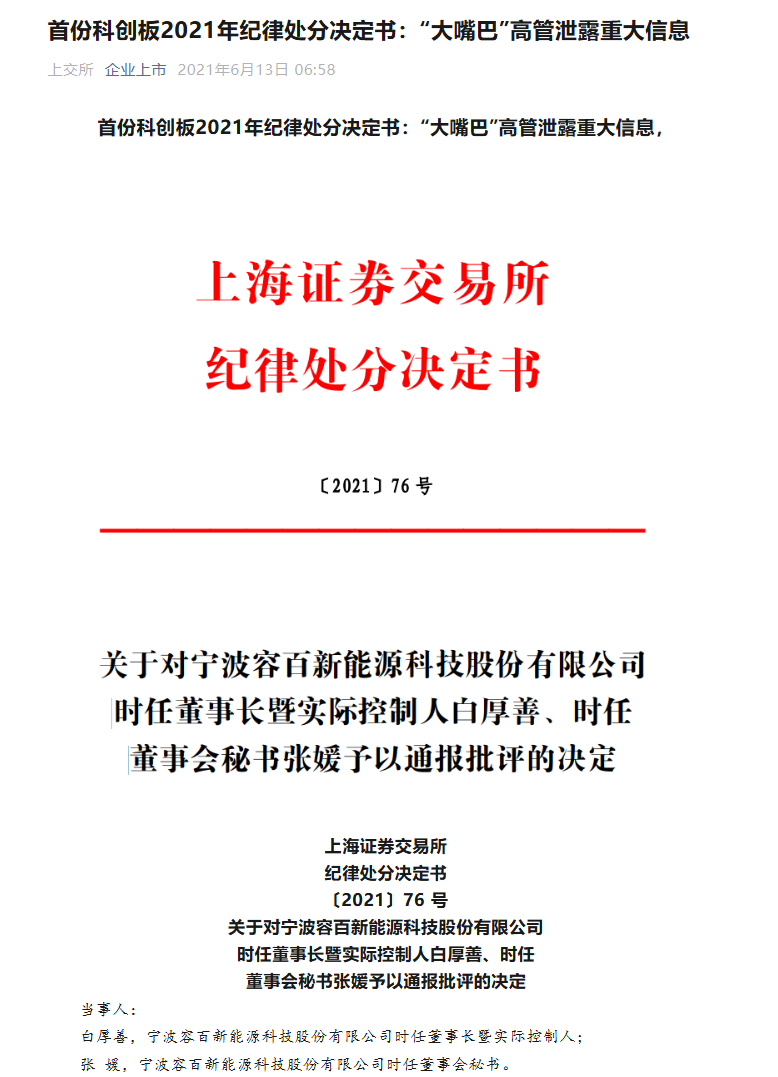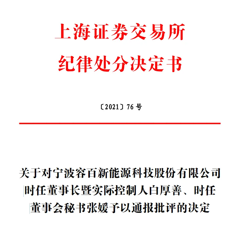鉴于上述违规事实和情节,根据《科创板股票上市规则》第14.2.1 条、第 14.2.3 条、第 14.2.5 条和《上海证券交易所纪律处分和监管措施实施办法》《上海证券交易所上市公司自律监管规则适用指引第 2 号——纪律处分实施标准》的有关规定,本所决定对宁波容百新能源科技股份有限公司时任董事长暨实际控制人白厚善、时任董事会秘书张媛予以通报批评。
