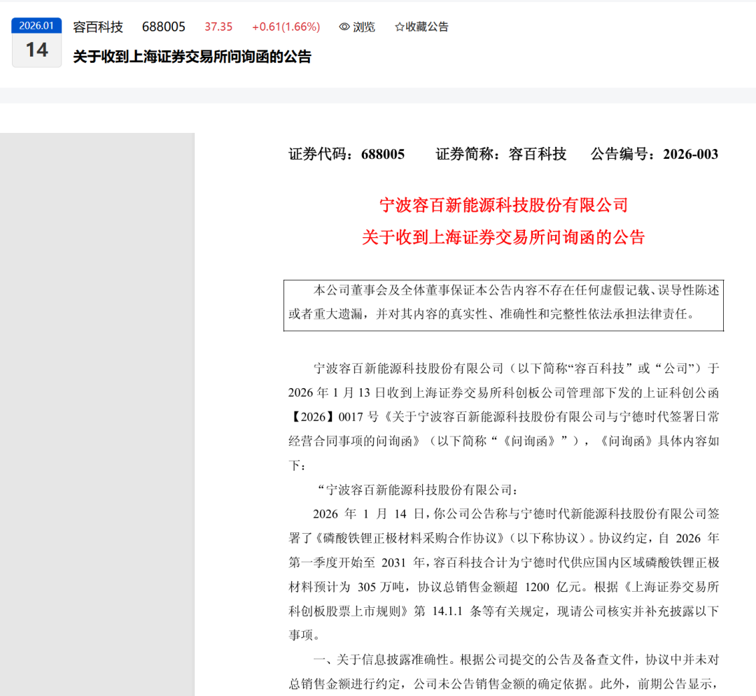 宁波容百新能源科技股份有限公司(以下简称“容百科技”或“公司”)于2026年1月13日收到上海证券交易所科创板公司管理部下发的上证科创公函【2026】0017号《关于宁波容百新能源科技股份有限公司与宁德时代签署日常经营合同事项的问询函》(以下简称“《问询函》”),公司就《问询函》有关问题逐项进行认真核查落实,现将有关问题回复如下: