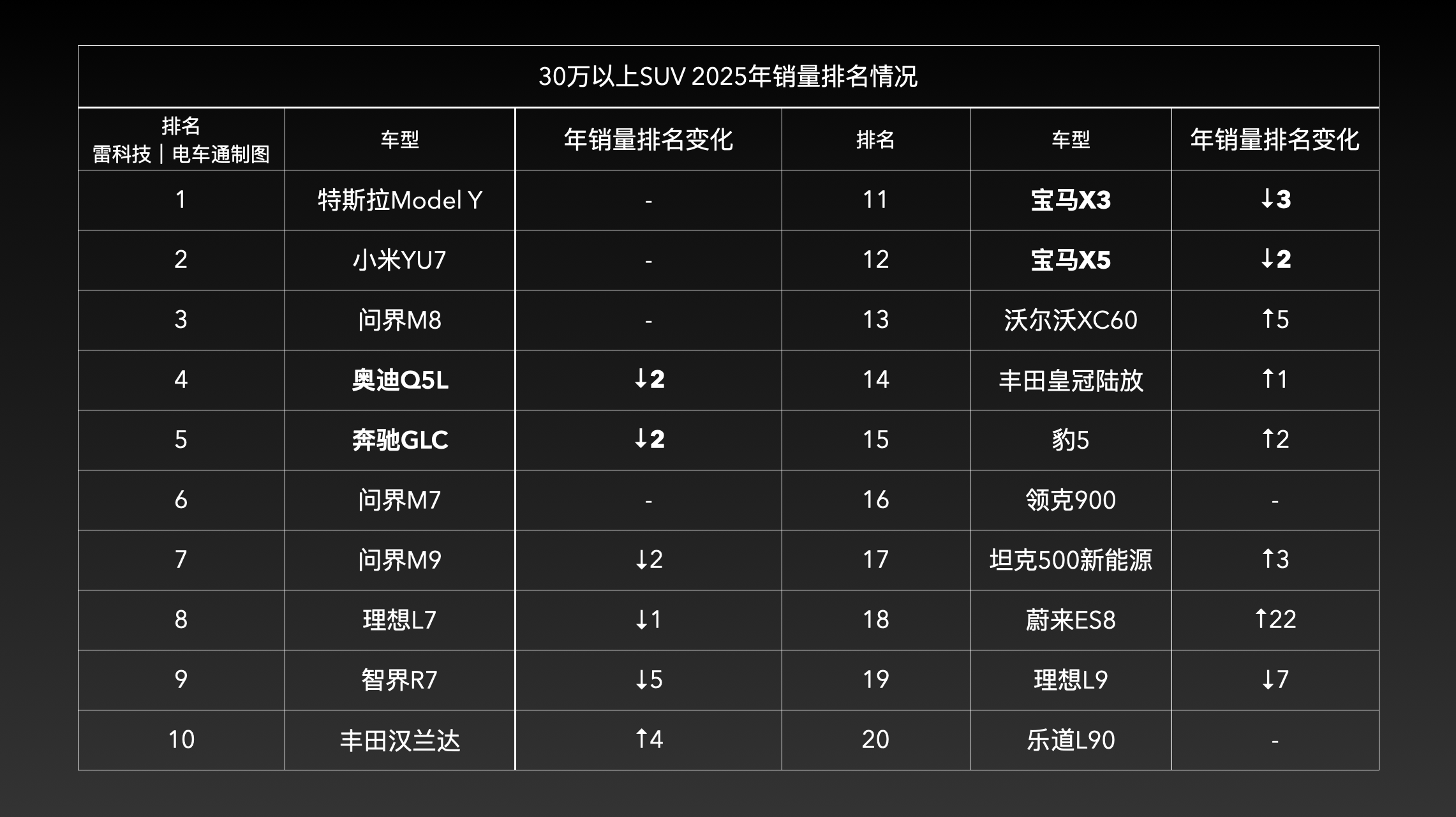 回看去年30万以上SUV战场:奥迪Q5L、奔驰GLC、宝马X3/X5这些老牌贵族节节败退;而对面,小米YU7、问界M8、蔚来ES8等新贵正集体冲高。