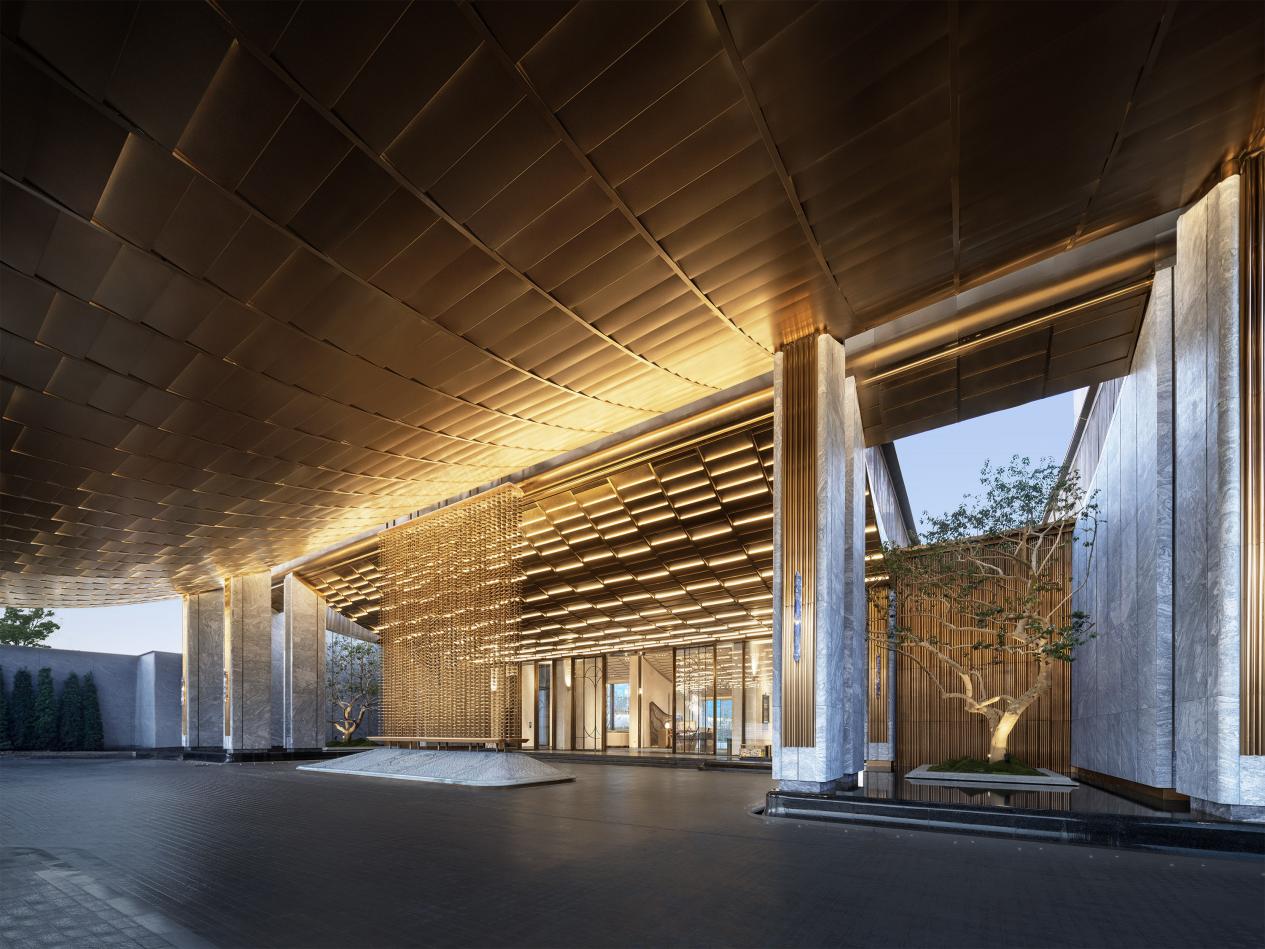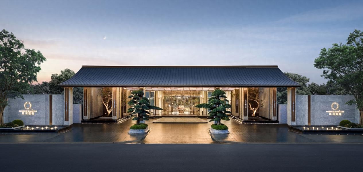 而在苏州凤起潮鸣,文化的转译则化为更为精妙。社区门头以帝王冠冕为设计意象,顶部形态源自东方屋檐的当代提炼。大门中央定制“凤起冕旒”,以手工串联6045枚景泰蓝旒珠凤翎,取凤凰五色之青,采用巴西进口天然景泰蓝奢石,下方铺设超九米长的归家陛石,选用青白玉天然原石,复刻“双凤麒麟纹石雕”(中国国家博物馆藏)。通过材质与纹样的双重转译,将华夏礼制、皇家气象融入当代归家仪式之中。