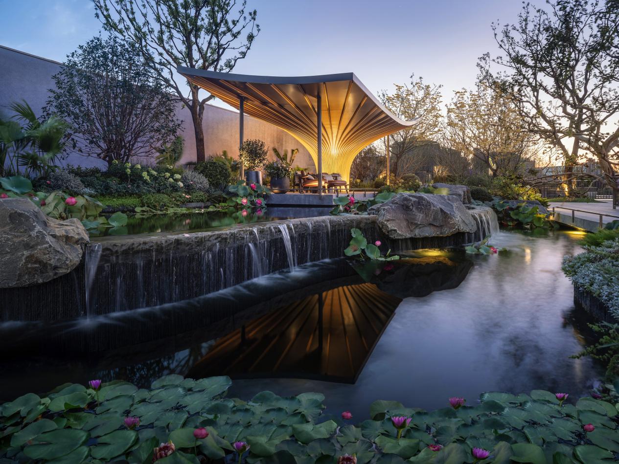 南京云庐坐落于“山水城林”的玄武区,项目的门头复现紫金山山峦剪影,打造约85米巨幅归家界面,内部的建筑群落呼应紫金山并依势布局,以南北双院为视觉焦点,通过复合、渗透等手法,在社区园林中植入双下沉庭院、悬浮嬉水池、松风茶室、童趣综合体等景观节点,将玄武区山水城林搬到楼下。