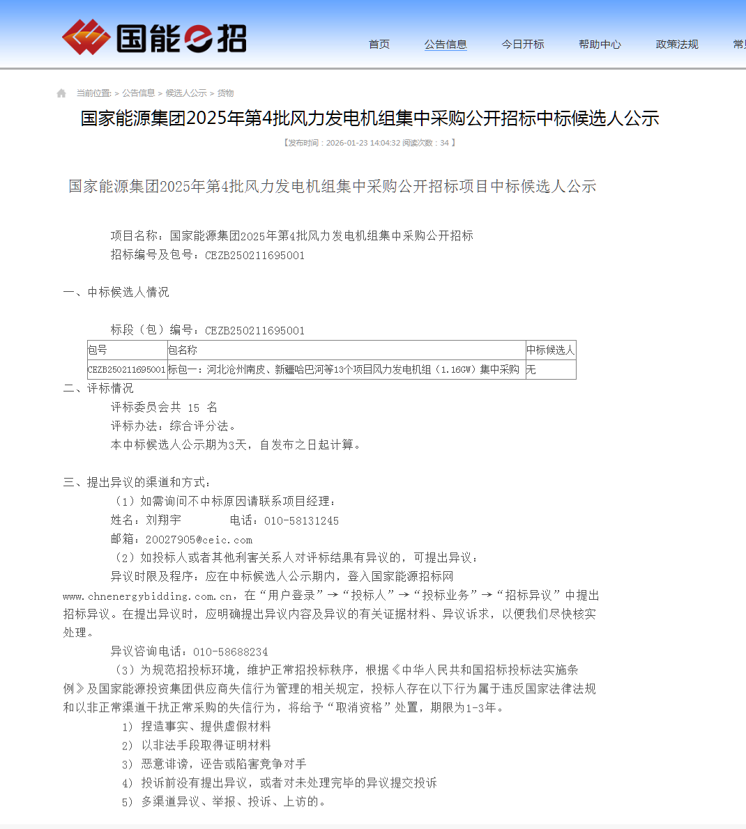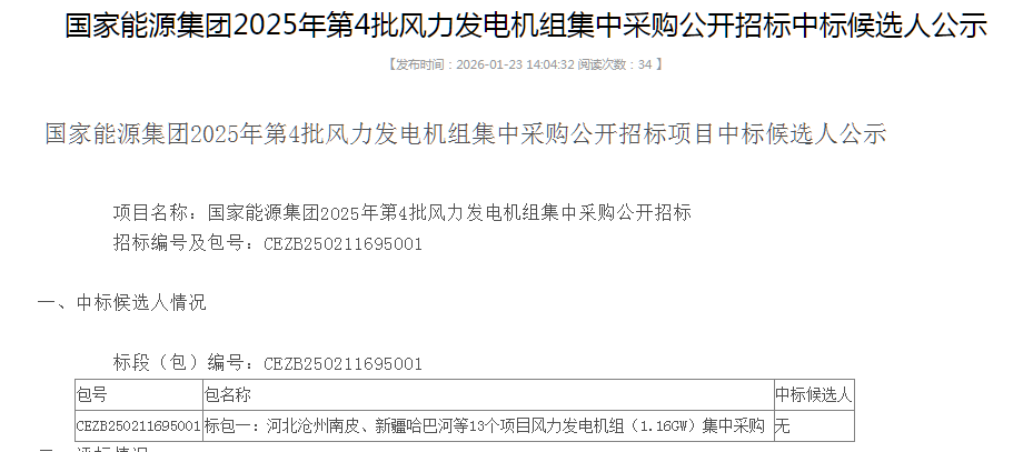 风电头条获悉,1月23日,国家能源集团2025年第4批风力发电机组集中采购-标包一中标候选人公示。