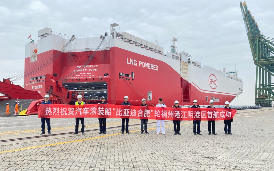 1月22日,比亚迪自有滚装船“合肥号”稳稳靠泊福州港江阴港区,在高效完成3120台整车装船作业后,将启航驶往宁波继续装载货物,随后前往美洲。这是比亚迪自有船队首次选择福州港出口整车,也是全国首创的商品车海铁联运“到站即到港”模式实现首单规模化应用,标志着福州港整车滚装出口进入新阶段。