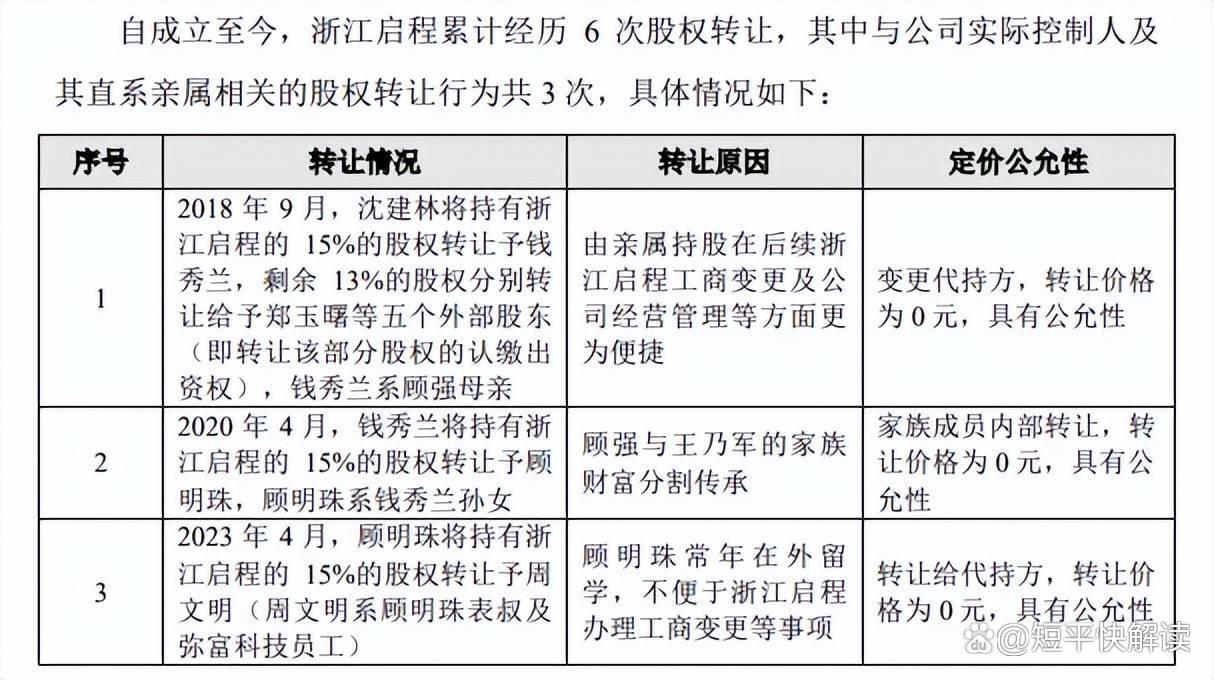 据披露,浙江启程是公司实际控制人顾强及王乃军女儿顾明珠实际持股15.00%的企业,成立之初,顾强曾委托沈建林代持该公司股份,持股比例为28%,2018年9月,沈建林将15%、13%分别转让给钱秀兰(顾强母亲)、以及郑玉曙等五个外部股东;2020年4月,顾强与王乃军离婚,根据双方对于家族财富的分割传承安排,钱秀兰将15%的股权转让予顾明珠;2023年4月,因常年在外留学的原因,顾明珠委托周文明代持15%股份,后者是系顾明珠表叔及弥富科技员工。