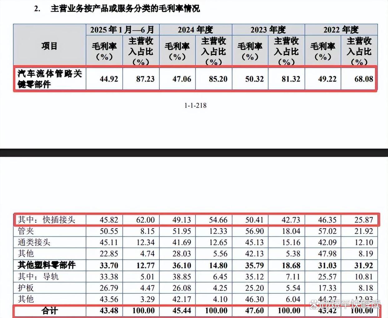 需要指出的是,主营业务毛利率波动较为明显,分别为43.42%、47.6%、45.44%、43.48%,期末较高点下滑4.12个百分点,汽车流体管路关键零部件分别为49.22%、50.32%、47.06%、44.92%,其中快插接头毛利率分别为46.35%、50.41%、49.13%、45.82%,较高点下滑4.59个百分点。