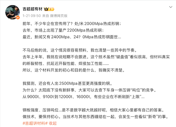 近日,理想材料负责人吉超发文表示:“前年,不少车企在宣传时称使用了多少处或多少米的2000Mpa热成形钢;去年,市场上出现了量产2200MPa热成形钢;最近,新闻又有2400MPa热成形钢面世…不马后炮地说,这个情况很容易预料,我也清楚一些其中的节奏。这个技术虽然‘键盘值’看似很高,但材料真实的断裂韧性、抗延迟开裂性能、焊接加工性能……所以,这个材料开发的初心和目的是什么,我确实不清楚。”