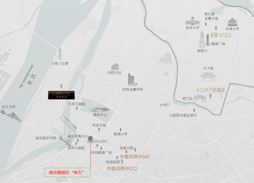 位置相当金贵,与7/10号线中胜路站无缝衔接,马路对过就是龙湖天街,直线距离河西CBD核心区的河西中央公园、南京国金中心、河西德基广场大约1公里。目前板块内暂无新房,在售二手房挂牌均价在3.7万/㎡~6.1万/㎡。
