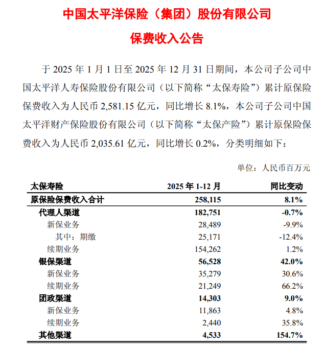 中国太保公布的2025年全年保费数据显示,银保渠道保费大增42%,而代理人渠道下降了0.7%。