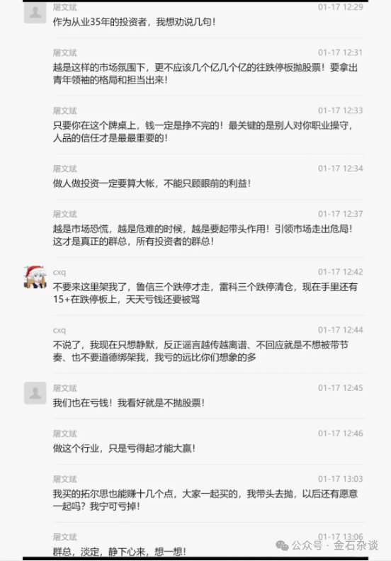 而后陈小群被另一位牛散屠文斌教育:越是这样的氛围越不应该几个亿个亿的抛售,要拿出顶级游资的格局和担当出来,不能只顾眼前利益,越是危难,越应带领市场走出危局。