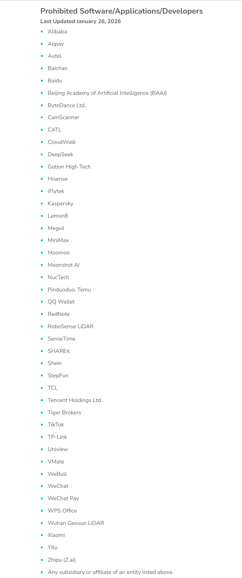 此次被列入限制使用清单的主题有:阿里巴巴集团、DeepSeek、TCL、TikTok、TP-Link、商汤科技、旷视科技、云从科技、小米集团等,