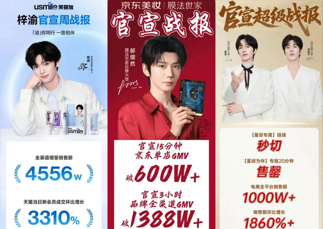 除文章开头所述云旗的带货表现外,梓渝、郝熠然、常华森、田栩宁、邱鼎杰等新晋流量男星的带货能力亦不容小觑。根据各家战报数据,usmile笑容加官宣梓渝为品牌代言人当天全渠道GMV贡献2586w+元,天猫当日新会员成交环比激增3310%,一周狂揽4556w+元增量销售额;膜法世家官宣郝熠然为品牌代言人15分钟京东单店GMV达600w+元,3小时全渠道GMV破1388w+元;拉芳官宣黄星、邱鼎杰为品牌大使当日“星邱专属”链接秒切,“星邱为伴”专链20分钟售罄,电商全平台销售额达1000w+元,GMV环比暴涨1860%……
