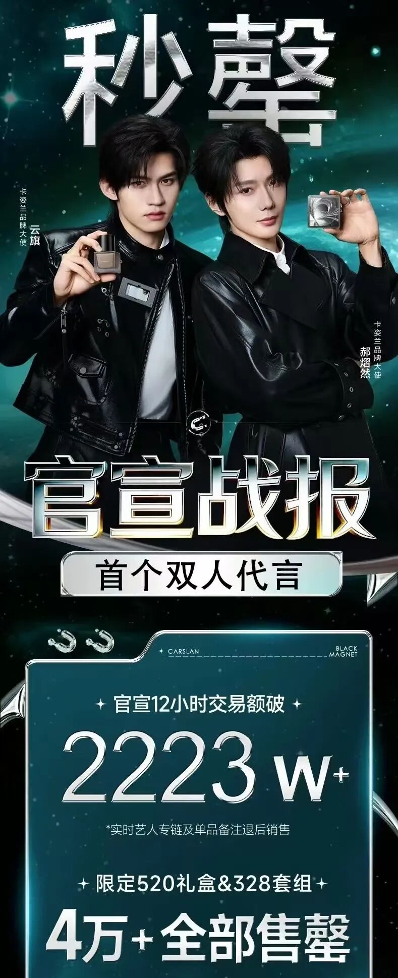 除《逆爱》田栩宁、梓渝,《吾岸》郝熠然、云旗,《垂涎》黄星、邱鼎杰、江衡,《归棹》马柏全,都进入了美妆品牌的视野。其中,卡姿兰发布首个双人代言,同时官宣云旗&郝熠然为品牌大使。根据官方战报数据,双人首代的效果十分可观,品牌官宣12h交易额便突破2223w+元(实时艺人专链及单品备注退后销售)。无独有偶,拉芳也同时官宣了黄星&邱鼎杰为品牌大使,打造“星邱为伴”套装,创下千亿级品牌销售额和十亿级曝光量。