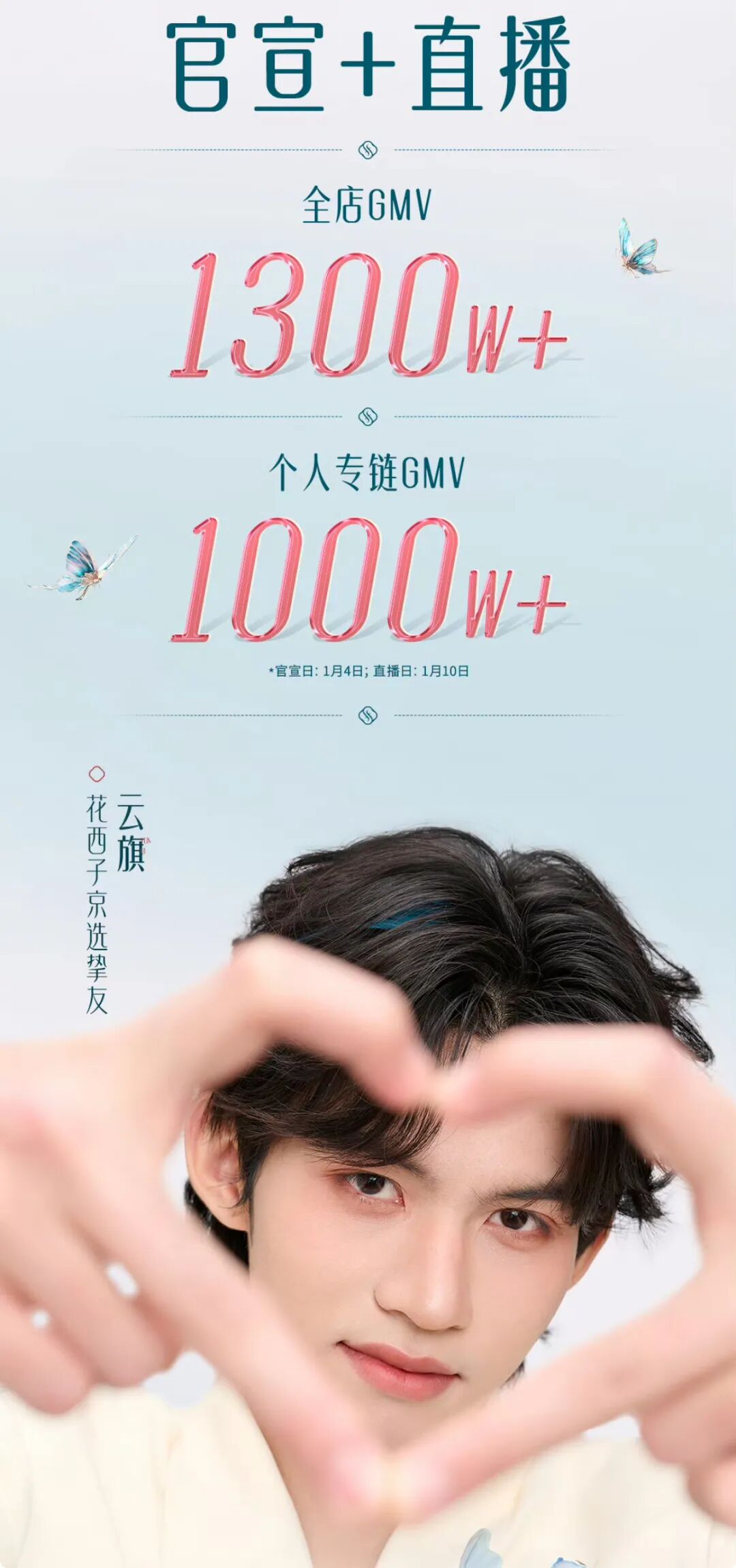 而不久前(1月4日),在花西子官宣云旗为品牌京选挚友的28小时内,品牌全店GMV破711w+元;1月10日,云旗空降花西子直播间,自此直播日+官宣日品牌全店GMV达1300w+元,个人专链GMV破1000w+元。