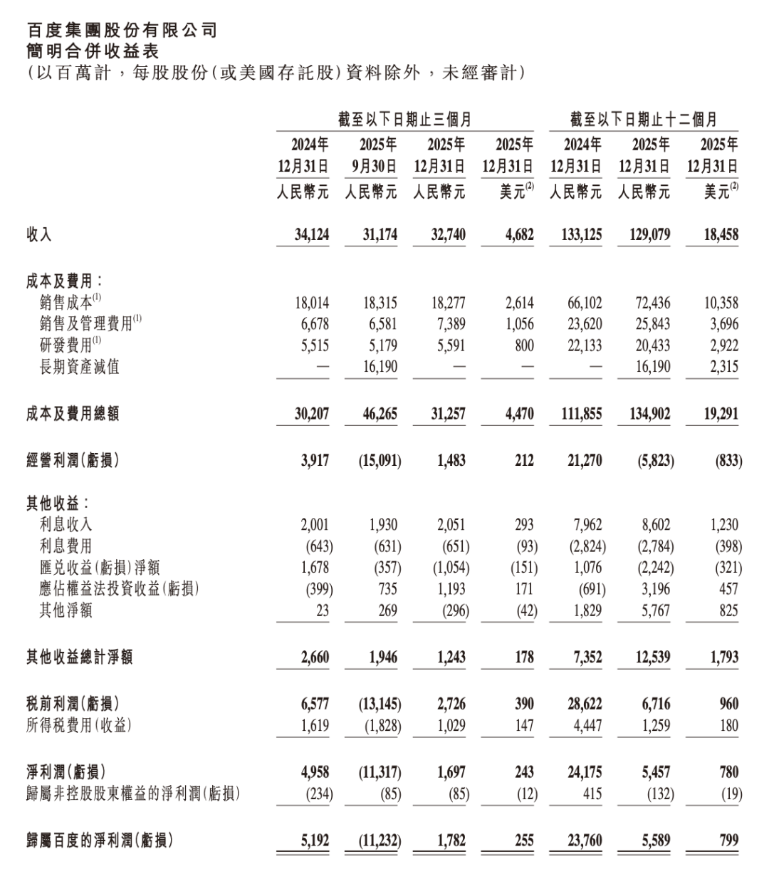 成本方面,销售成本同比增长10%,达到724亿元人民币(103.6亿美元),主要源于核心AI新业务相关成本的大幅增加。这表明百度在AI业务的拓展上投入巨大,从技术研发到市场推广,各个环节都需要大量资金支撑。销售及管理费用为258亿元人民币(37.0亿美元),同比增长9%,渠道支出费用及预期信用损失的增加是主因。研发费用为204亿元人民币(29.2亿美元),同比减少8%,主要是人员相关费用降低所致。这可能意味着百度在研发团队管理上进行了优化,但研发投入的减少是否会对未来的创新能力产生影响,值得关注。