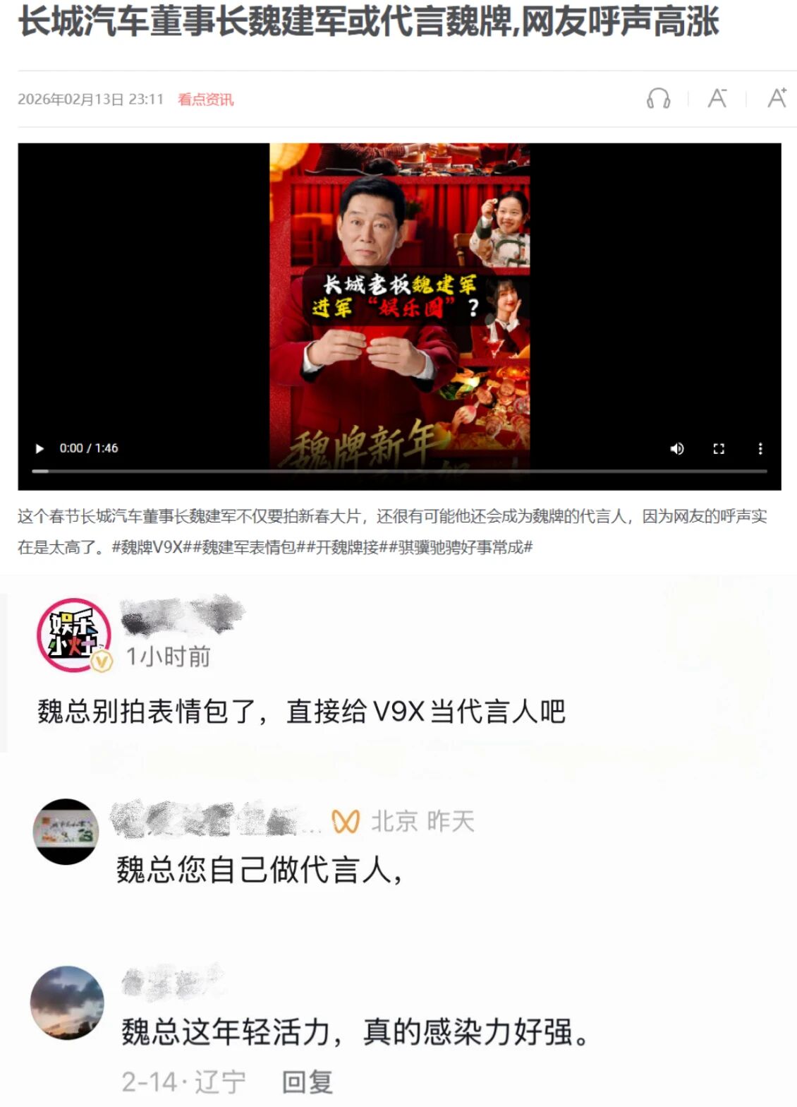 他不端架子,以创始人身份亲自下场,为魏牌拍新春TVC,发表情包……这一系列接地气操作引发全网热议。