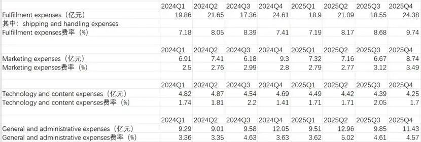 3)所得税费用减少、Share of income of equity method investees的同比大增,当然,这2个科目带来的增益也一定程度抵消了汇兑收益的消失(25Q4汇兑亏损0.17亿元,而24Q4汇兑收益1.39亿元)。25Q4唯品会的所得税费用为5.83亿元,同比-28.58%;Share of income of equity method investees为1.68亿元,同比+410.94%(2025全年为2.94亿元,同比+76.02%)。有时候唯品会管理层总是会从一些意想不到的科目中做做功课。