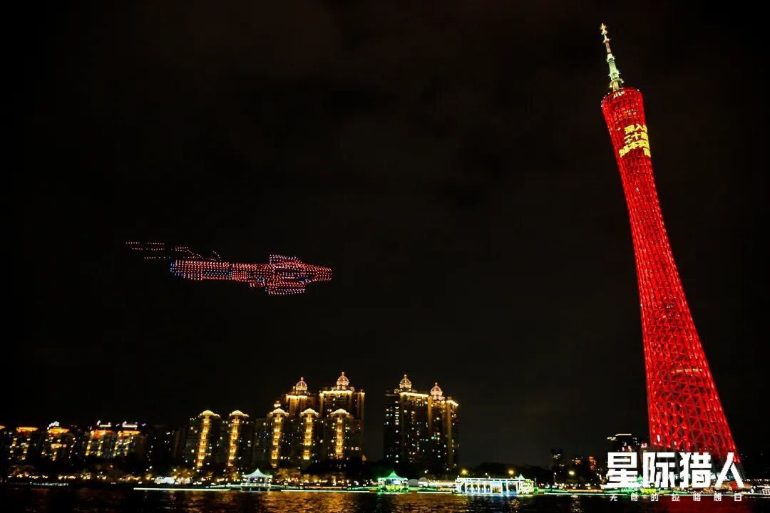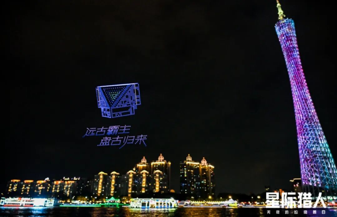 上个月31号,为了庆祝品牌焕新,游戏在广州塔旁开启了千架无人机的表演,不仅还原了游戏内诺玛运输、木星工业、安东尼奥斯、未央综合四大公司的标志性舰船,还展示了四款盘古体系新舰船的雏形。