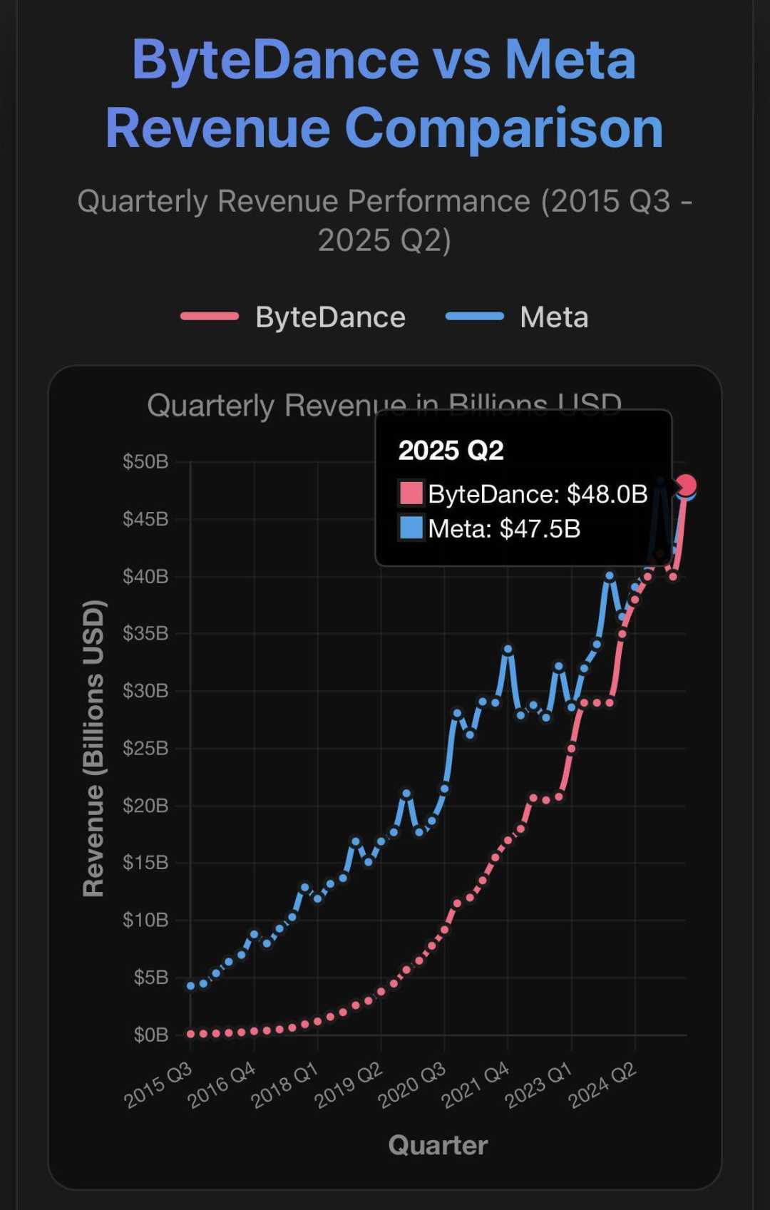 路透社透露,2025年第一季度、第二季度,字节跳动的营收分别超过430亿美元、480亿美元,同比增长25%,高于Meta的423亿美元、475亿美元,成为全球收入最高的社交媒体公司。