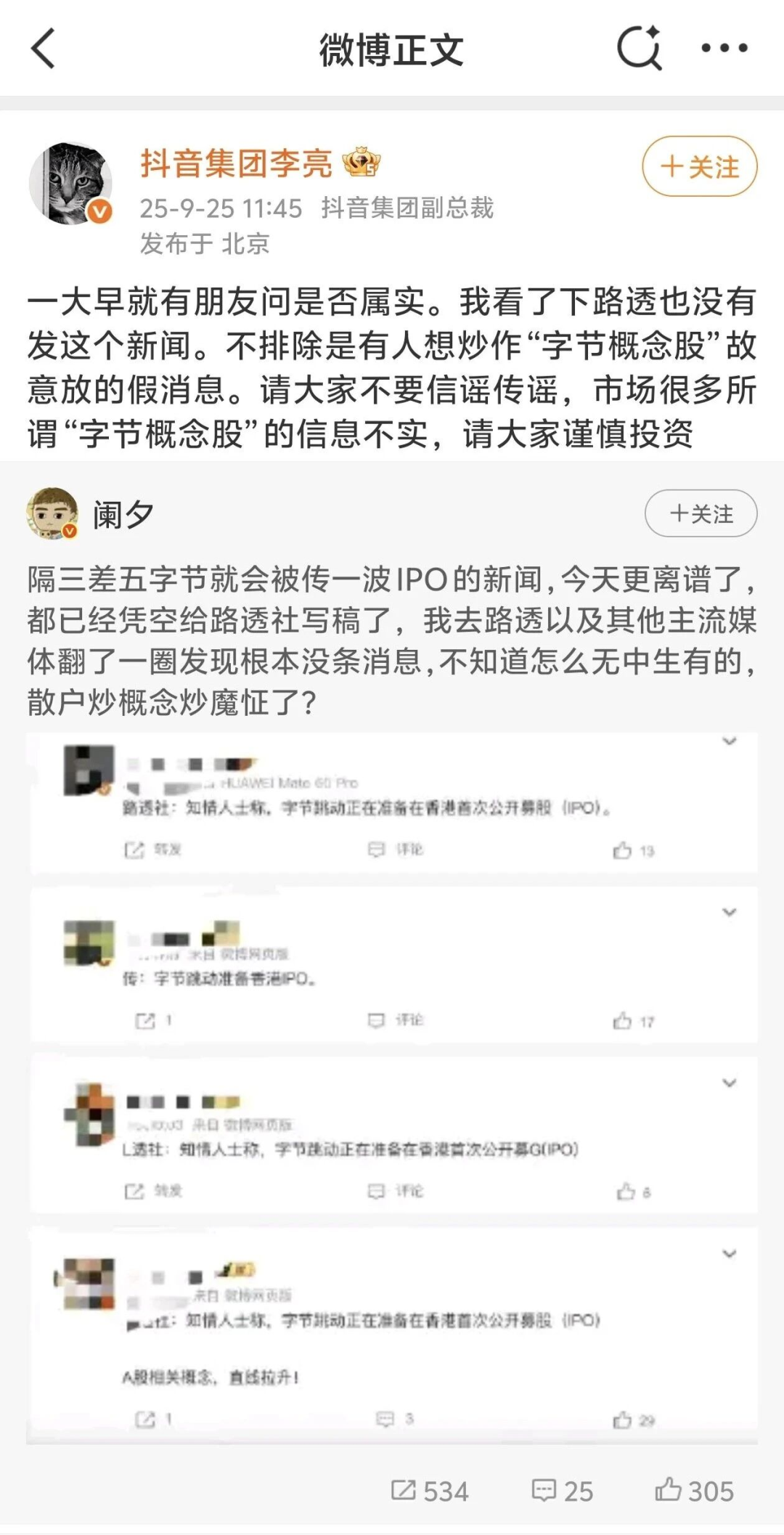 最近一次,是在2025年9月25日,当时市场再次传出即将赴港上市的消息,抖音集团副总裁李亮很快便进行辟谣,称“不排除是有人想炒作‘字节概念股’故意放的假消息”。