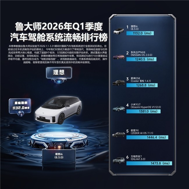 鲁大师2026年Q1汽车季报正式发布,涵盖驾舱系统流畅榜与车机语音AI识别率榜两个榜单。所有数据均来自严谨可靠的实测流程,测试时间跨度为2026年1月1日至3月31日。