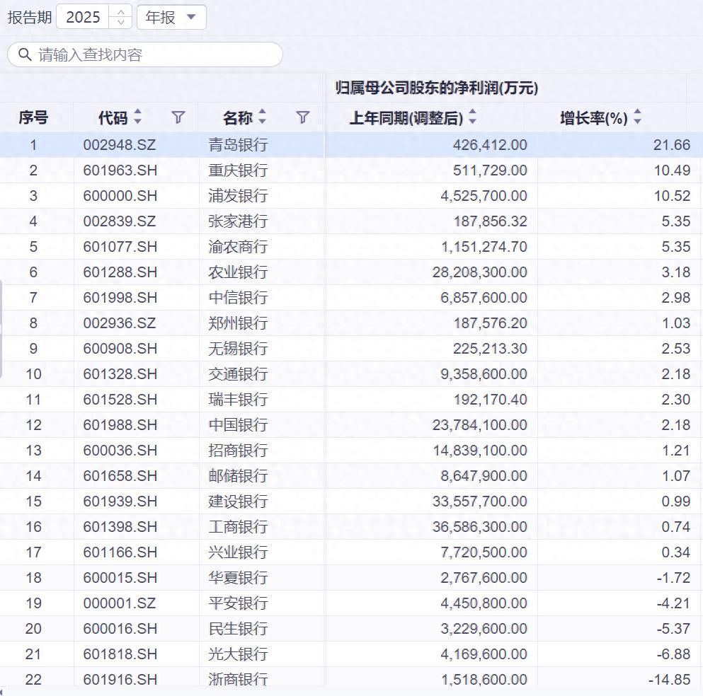 其中,城商行盈利增速亮眼,就归母净利润来看,青岛银行2025年归母净利润以21.66%的同比增速位列首位;营收方面,重庆银行同比增速10.48%,是上述22家银行中唯一营收增速达两位数的银行。