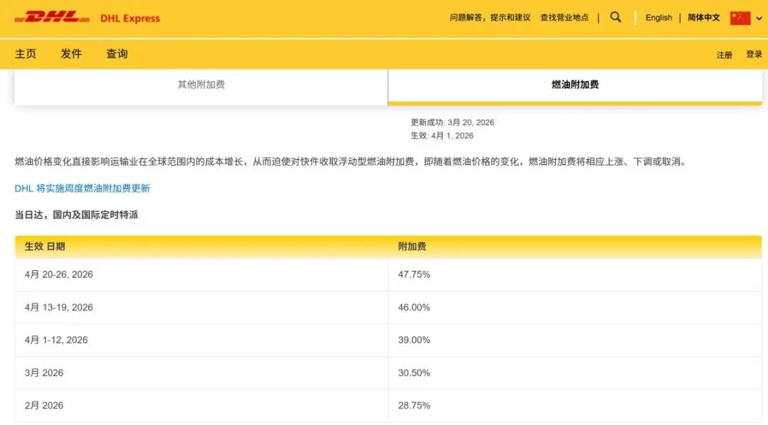 中新经纬注意到,进入4月,DHL燃油附加费率已连涨两周,4月20日至26日当周,将进一步涨至47.75%,较2026年2月的28.75%近乎翻倍。UPS、FedEx、顺丰国际的燃油附加费率在4月6日至12日当周环比下降后,最新一周(4月13日至19日当周)再度恢复上涨。