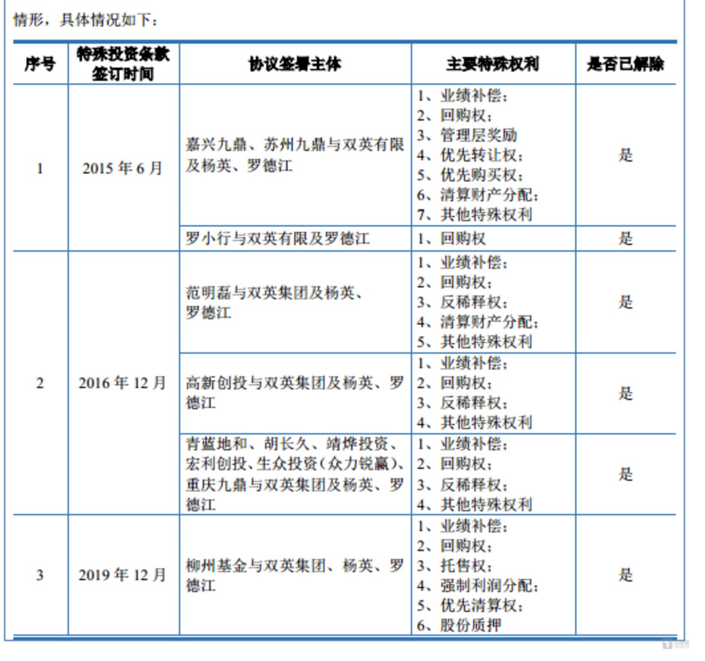 2016年12月,双英集团通过定向发行的形式新增股东范明磊、高新创投、胡长久、重庆九鼎、生众投资、宏利创投、青蓝地和、靖烨投资等8名股东,并签署了包含回购权等特殊性条款的协议。2019年9月,因触发对赌情形,公司实际控制人通过引入柳州基金受让高新创投所持公司股份以及受让青蓝地和等6名股东,不足部分由实际控制人杨英以现金补偿的形式,履行回购义务,第二次对赌也以失败告终。