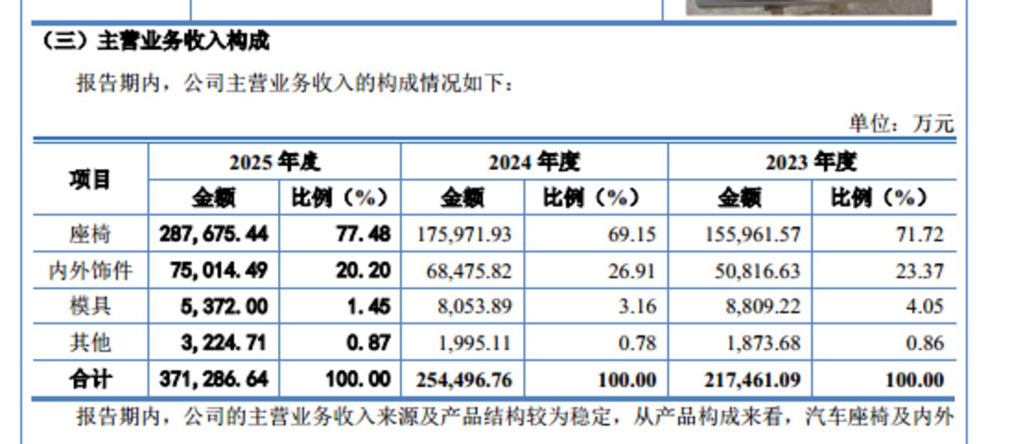 从产品结构来看,双英集团主要拥有座椅、内外饰件、模具、其他等业务,其中座椅业务是公司创收最高的板块,报告期内产生的销售收入分别为15.6亿元、17.6亿元、28.77亿元,分别占当期主营业务收入的71.72%、69.15%、77.48%,是公司创收最高的业务,核心地位突出。