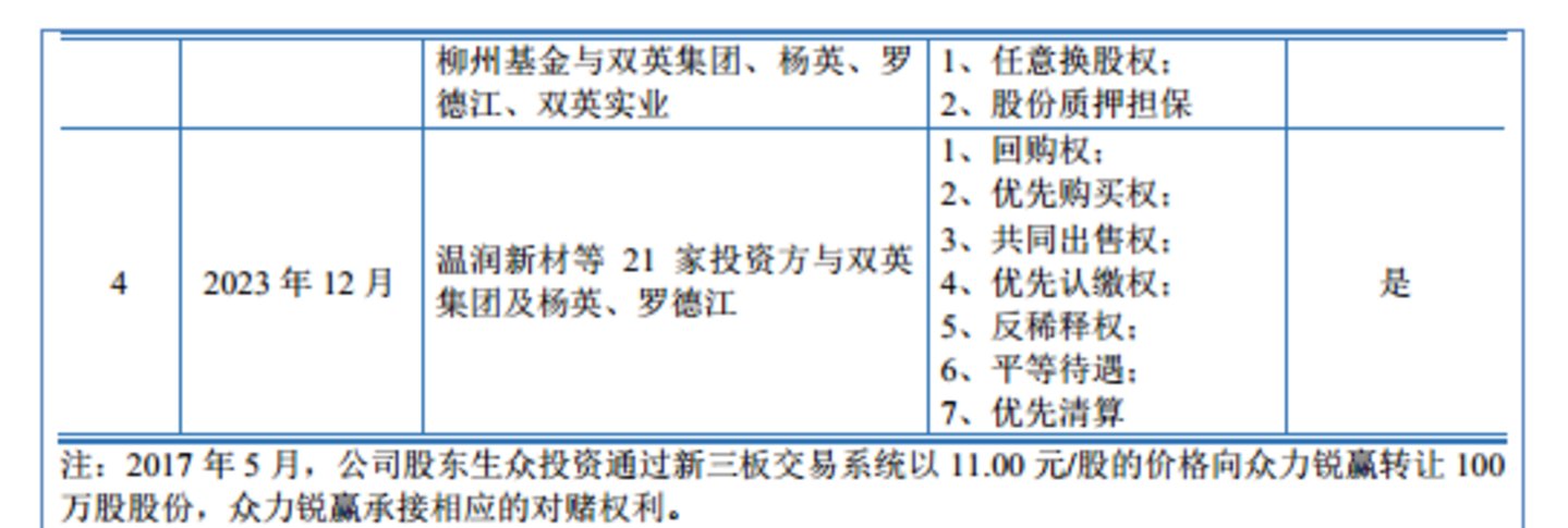 2023年12月,因根据《股份转让协议》及相关补充协议、《可交换债投资协议》及相关补充协议,双英集团实际控制人罗德江向柳州基金履行回购义务,按照前述合同约定价格进行回购。根据柳州基金与公司及实际控制人杨英、罗德江于2023年12月签署的《股份回购协议》,柳州基金根据前述协议拥有的股东特殊权利全部解除。也就是说,双英集团与柳州基金之间的对赌也已失败告终。