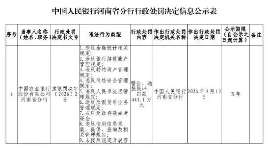 中国人民银行河南省分行行政处罚决定信息公示表显示,中国农业银行股份有限公司河南省分行因违反:“金融统计相关规定、银行结算账户管理规定、特约商户管理规定、网络安全管理规定、人民币流通管理规定、反假货币业务管理规定,占压财政存款或者资金,违反信用信息采集、提供、查询及相关管理规定,未按照规定开展客户尽职调查,未按照规定报告大额交易,未按规定报告可疑交易”等行为,被警告、通报批评,罚款441.1万元。