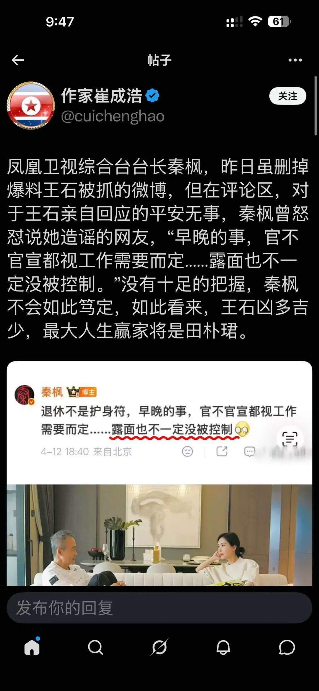 就在许家印受审的前一天,4月12日,万科创始人王石“被抓”的消息在社交平台病毒式传播,散播这一谣言的是香港卫视综合台台长秦枫,引发了全网热议。