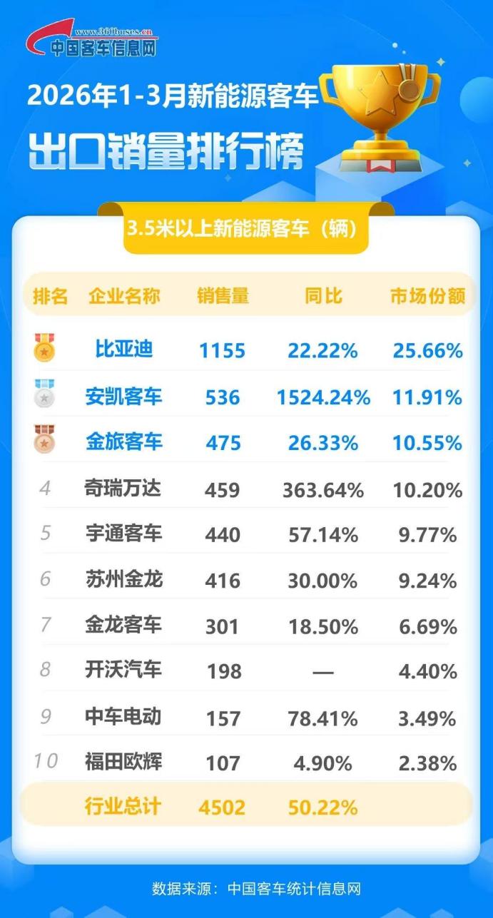 据中国客车信息网数据显示,2026年3月,比亚迪新能源客车出口再次位列第一,同比增速21.52%,高于行业平均水平。至此,一季度,比亚迪新能源客车总出口1155辆,市场份额25.66%,稳居榜首,彰显强劲的海外市场竞争力;是行业唯一出口新能源客车超过1000辆的企业,也已连续三年蝉联新能源客车出口冠军。