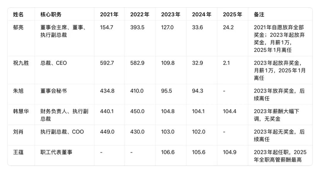 万科2021-2025年核心高管税前薪酬统计表