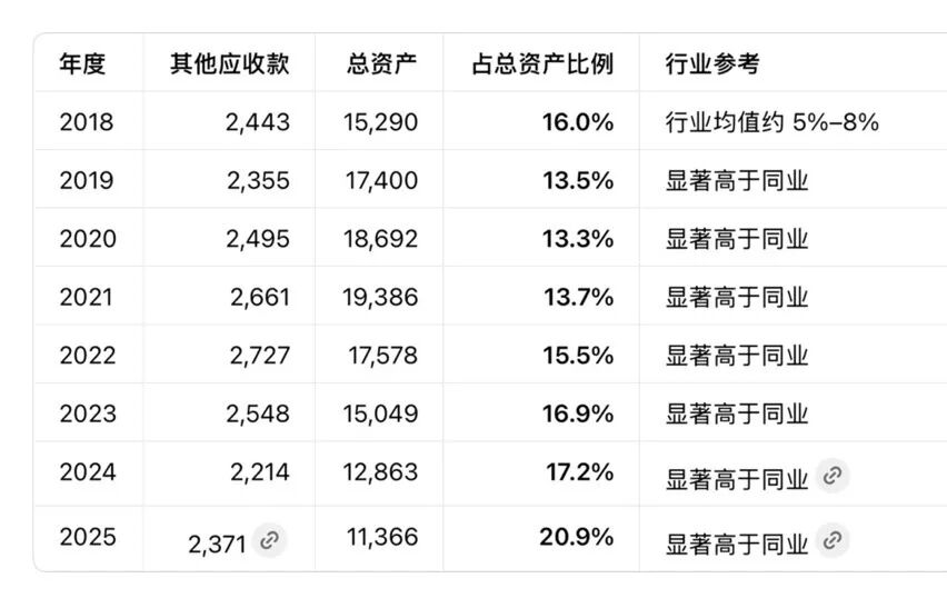 资金占用是影子万科掏空万科的另一大核心手段,也是导致万科后续现金流断裂、巨额亏损的直接原因。在财务报表中,其他应收款科目成为管理层实现资金外流的主要通道,这个科目原本用于核算企业经营活动以外的短期应收款项,正常金额应维持在较低水平,但在万科的报表中,却成为体外资金流转的“蓄水池”。