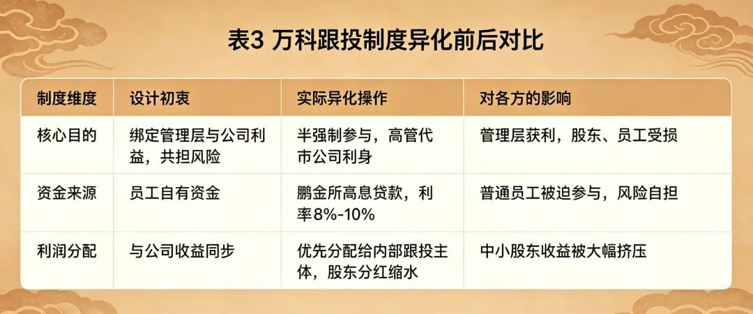 然而,在宝万之争后内部人控制的格局下,这套原本旨在完善治理的制度,彻底走向异化,完全脱离了设计初衷,沦为管理层隐秘套利、转移上市公司利润、侵害中小股东利益的工具。这种异化是全方位的,从参与主体、资金来源到利润分配,每一个环节都被管理层操控,形成了“利润私有化、风险公有化”的恶劣局面。
