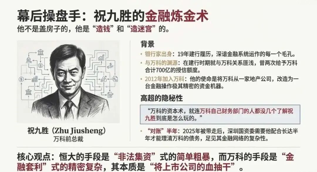 如果说宝万之争为内部人控制搭建了舞台,那么“影子万科”体系,就是管理层掏空上市公司的核心载体与核心工具。这套由祝九胜等核心财务高管实际操控的体外利益网络,经过数年的精心搭建,形成了一套层层嵌套、隐秘至极的资本体系,表面上与万科上市公司无任何直接股权关联,实则深度绑定万科的资金、项目、资源,成为管理层截留利润、转移资产、侵占利益的“私人后花园”,也是万科千亿亏损的核心源头。