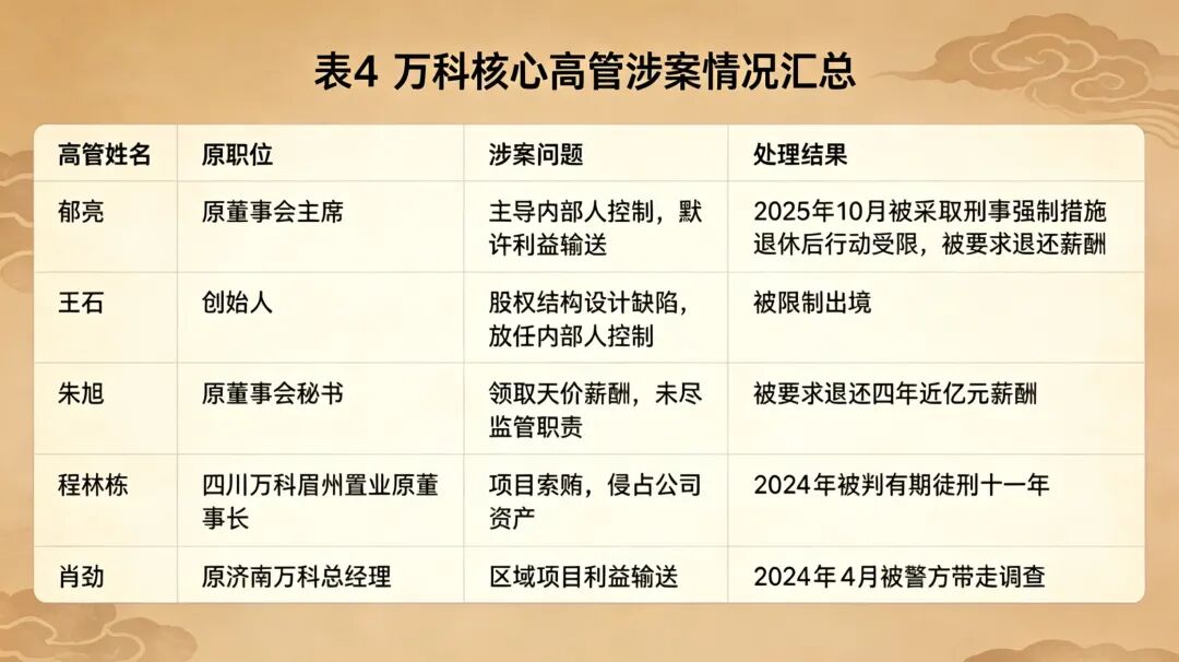 集团层面:祝九胜被采取刑事强制措施,面临多项刑事指控;郁亮退休后被限制出境,行动受限,被监管部门要求退还违规薪酬;创始人王石因股权结构设计缺陷、放任内部人控制,被限制出境;原董事长辛杰失联,配合相关部门调查;